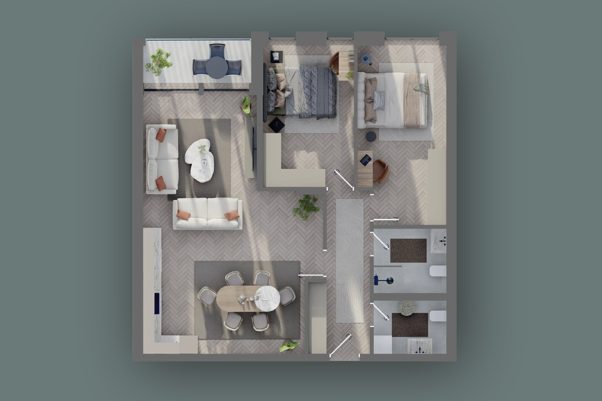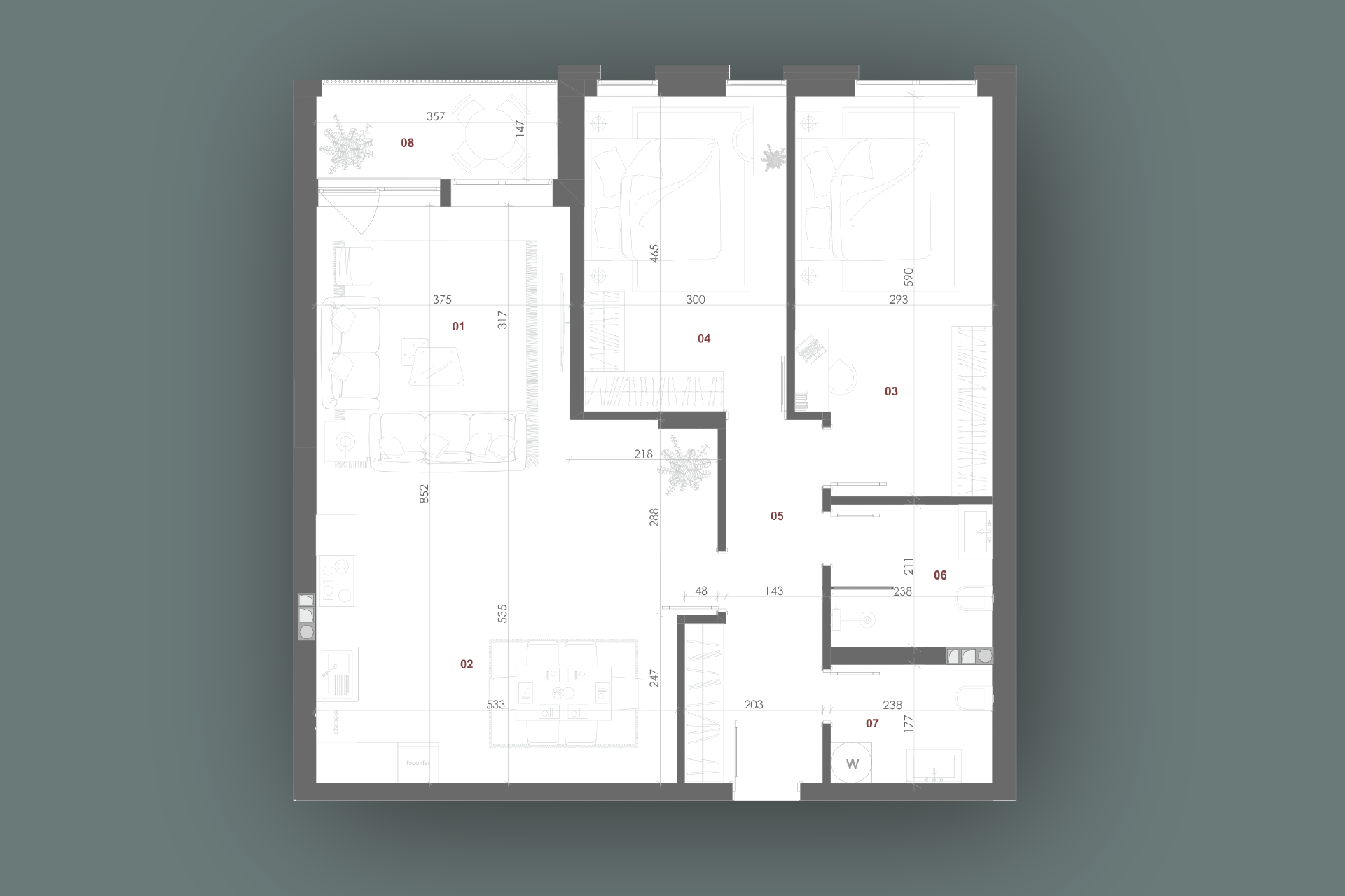 Ky apartament është dizajnuar për të ofruar hapësira të rehatshme dhe funksionale për çdo familje. Qëndrimi ditor, i ndriçuar dhe i bollshëm, është i përsosur për momente relaksi dhe argëtimi, ndërsa kuzhina dhe tryezaria krijojnë një ambient të ngrohtë për gatime dhe darka familjare. Dy dhomat e gjumit janë dizajnuar për rehati dhe privatësi, duke siguruar qetësi të plotë. Koridori lehtëson qarkullimin, ndërsa banjoja dhe tualeti ofrojnë komoditet të përditshëm. Loxha shton një hapësirë të këndshme për momente të qeta jashtë.