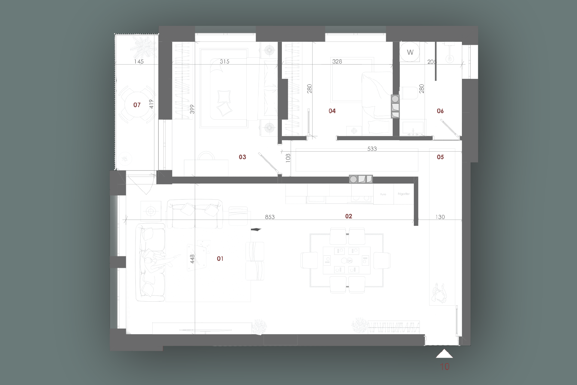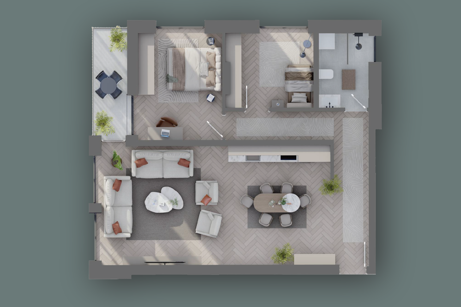 Ky apartament ofron një ambient të ngrohtë dhe të ndriçuar për një jetesë komode. Qëndrimi ditor është ideal për relaks dhe momente të këndshme me familjen apo miqtë. Kuzhina dhe tryezaria janë të dizajnuara për të krijuar një hapësirë të përshtatshme për përgatitjen e ushqimeve dhe darka familjare. Dy dhomat e gjumit ofrojnë rehati dhe qetësi, duke qenë perfekte për pushim. Koridori lejon lëvizje të lirë dhe praktike mes hapësirave të apartamentit. Banjoja ofron komoditetin e nevojshëm për përditshmëri. Ballkoni është vendi ideal për të shijuar ajrin e freskët dhe pamjet nga jashtë.