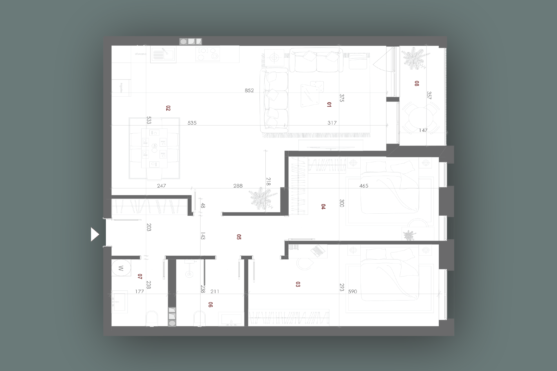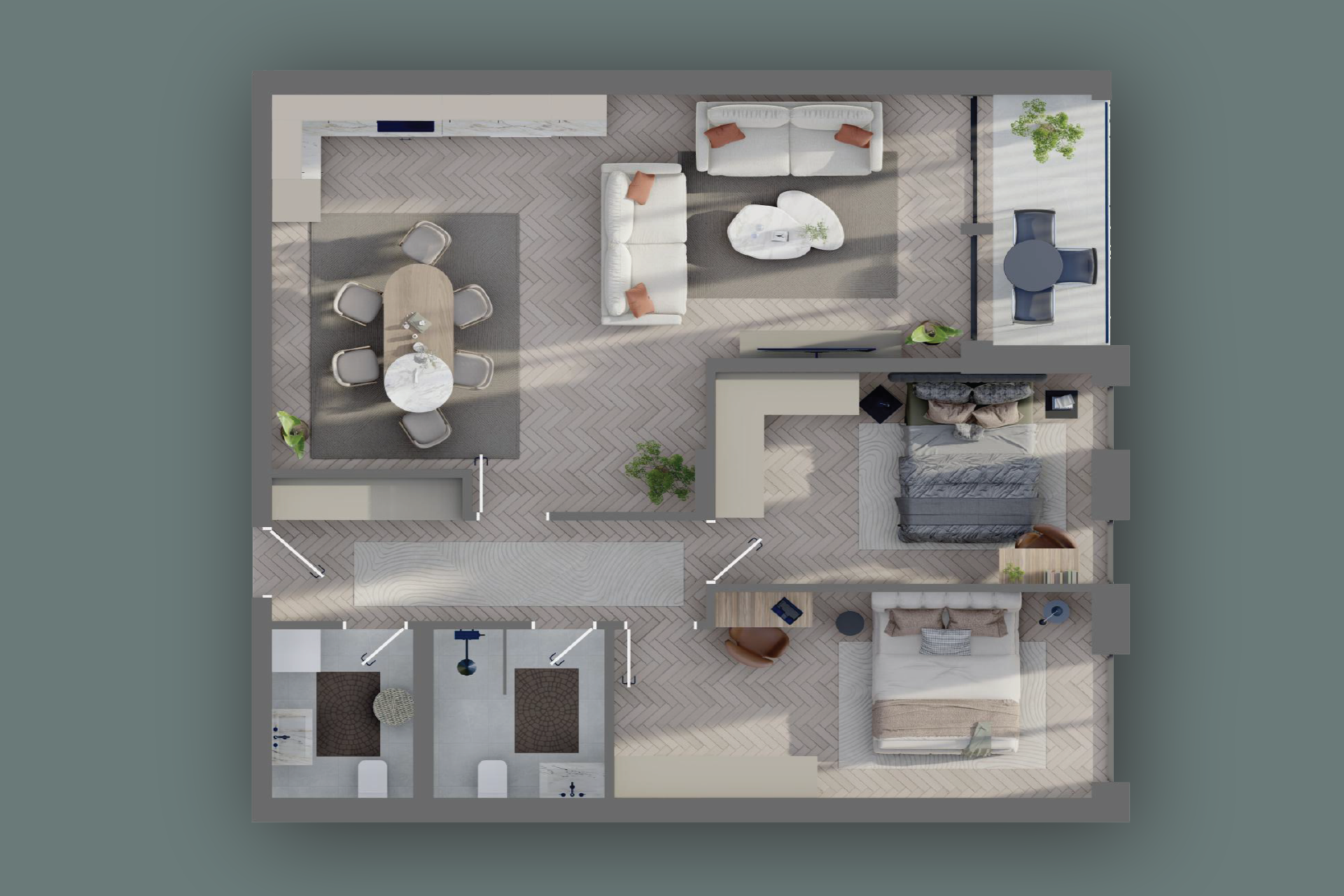 Ky apartament ofron një hapësirë të bollshme dhe të mirëorganizuar për një jetesë komode dhe moderne. Qëndrimi ditor është një ambient ideal për relaks dhe socializim, ndërsa kuzhina dhe tryezaria krijojnë një hapësirë të ngrohtë për gatime dhe vakte të përbashkëta. Dy dhomat e gjumit ofrojnë privatësi dhe rehati, të përshtatshme për një pushim të qetë. Koridori lehtëson lëvizjen mes hapësirave, ndërsa banjoja dhe tualeti ofrojnë komoditet të shtuar për përdorim të përditshëm. Loxha është vendi perfekt për të shijuar ajrin e freskët dhe për të kaluar momente të relaksuara jashtë.